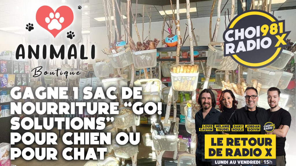 Cette semaine, écoute Le Retour de Radio X et tu pourrais gagner 1 sac de nourriture “Go! Solutions” pour chien ou pour chat, offert par Boutique Animali! 🎉