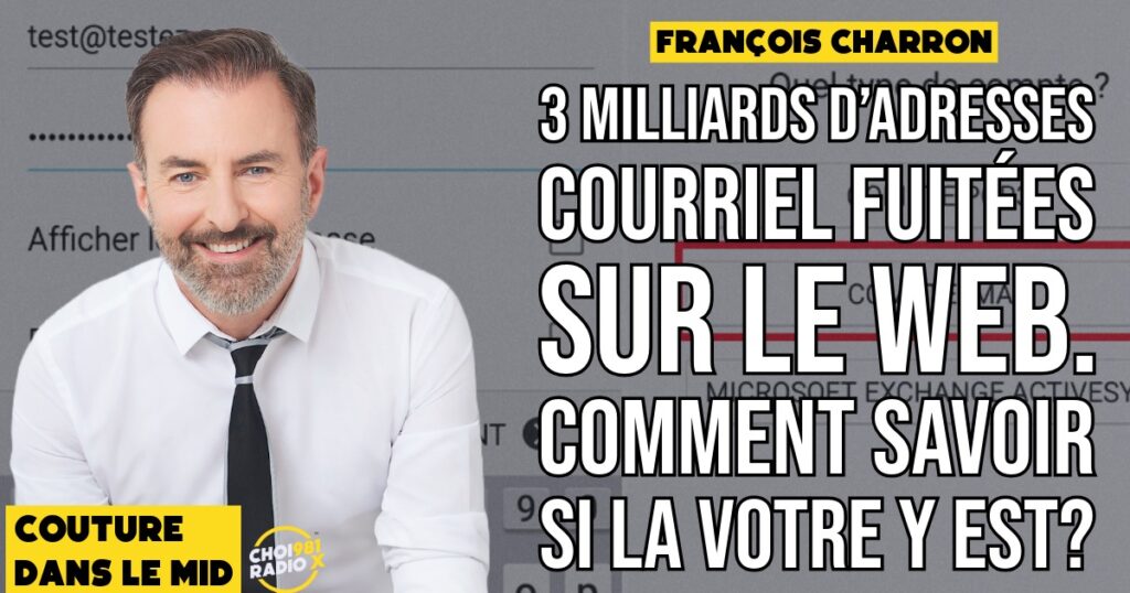 L’importance des mises à jour de ses navigateur – cette fois-ci c’est Chrome https://francoischarron.com/securite/fraude-et-arnaques-web/mise-a-jour-durgence-de-google-pour-corriger-une-faille-majeure-sur-chrome/lUqKKmTwtQ 3 milliards d’adresses courriel fuitées sur le Web. Comment savoir si la votre y est? https://francoischarron.com/securite/fraude-et-arnaques-web/-3-milliards-dadresses-courriel-compromises-et-diffusees-sur-le-dark-web/QqAoM2jyAw Des trucs pour protéger les données personnelles de sa famille sur le Web https://francoischarron.com/securite/logiciels-securite-prevention/comment-effacer-les-donnees-personnelles-de-sa-famille-sur-le-web/1myat5nzqh Transformer votre chauffe-eau en réservoir intelligent https://francoischarron.com/gadgets-techno/gadgets/transformez-votre-reservoir-deau-chaude-en-reservoir-intelligent-grace-a-ceci/FQPu0akyZy Petit cours 101 de […]